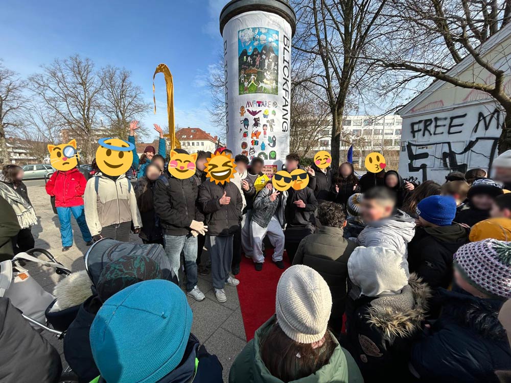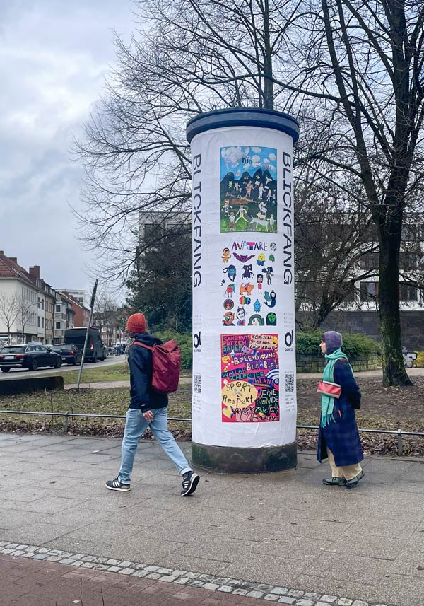 Insgesamt sind noch 20 weitere Plakate an anderen Schulen, Freizis und Kitas in Bremen entstanden. Kürzlich fanden die feierlichen Ausstellungseröffnungen an Litfaßsäulen in den jeweiligen Stadtteilen statt. Unser Plakat hängt nun vom 13. bis 23.02.26 an der Litfaßsäule Osterstraße x Buntentorsteinweg in der Bremer Neustadt. Alle Plakate werden dann noch einmal gemeinsam vom 06.03. – 03.05.2026 in den Schaufenstern des ehemaligen Kaufhof-Gebäudes in der Innenstadt zu sehen sein. Eröffnung ist am Freitag, 06. März um 14 Uhr.